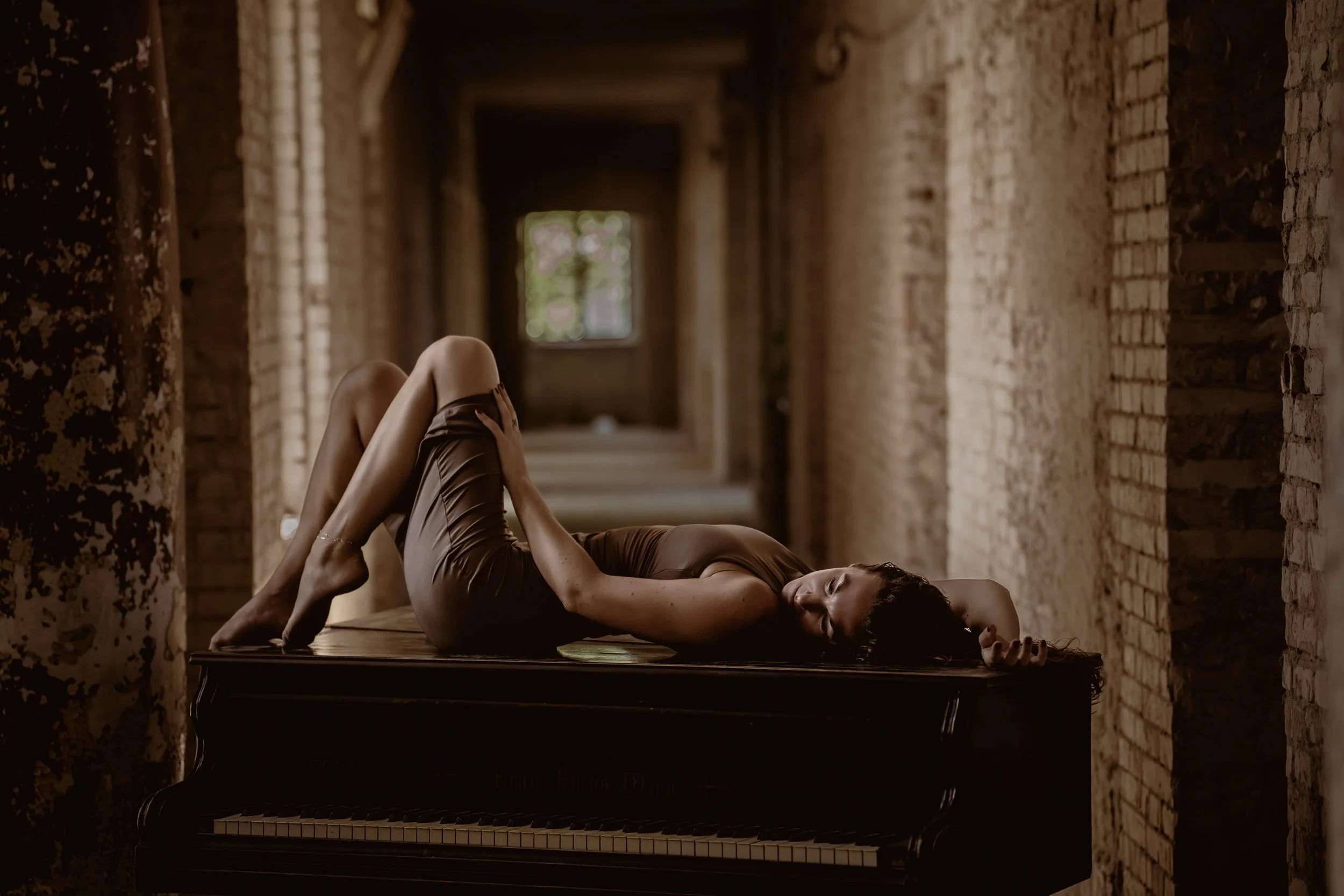 A régi hangszer nemcsak háttér, hanem főszereplő is, amely köré a pózok, mozdulatok és hangulatok épülnek. Hol több, hol kevesebb ruhában készülnek a képek, de mindig ugyanazzal a céllal: megmutatni, mennyi izgalmat rejthet egy elhagyatott tér és egy váratlan kellék találkozása.